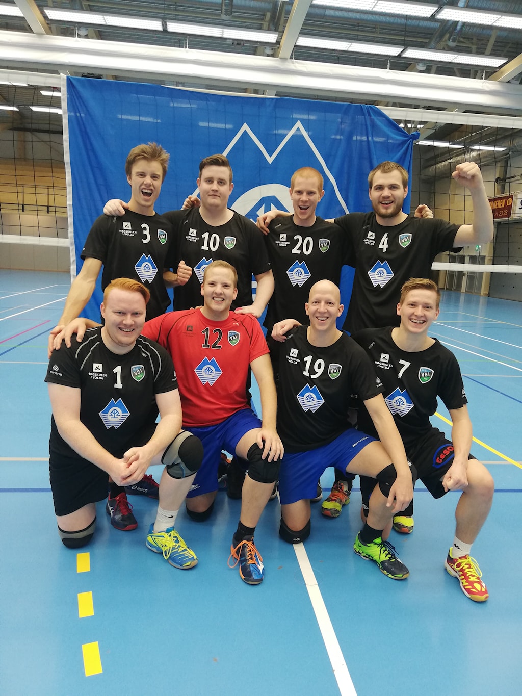 The team of (from backleft) Kåre Thue, Jørgen Kaland, Markus Haven, Christian Christiansen, (Front left) Tore Bjørnstad, Øystein Eldholm, Emil Strand and Roar Willumsen, won both matches 3 - 0 against Molce VBK and Ålesund VBK.